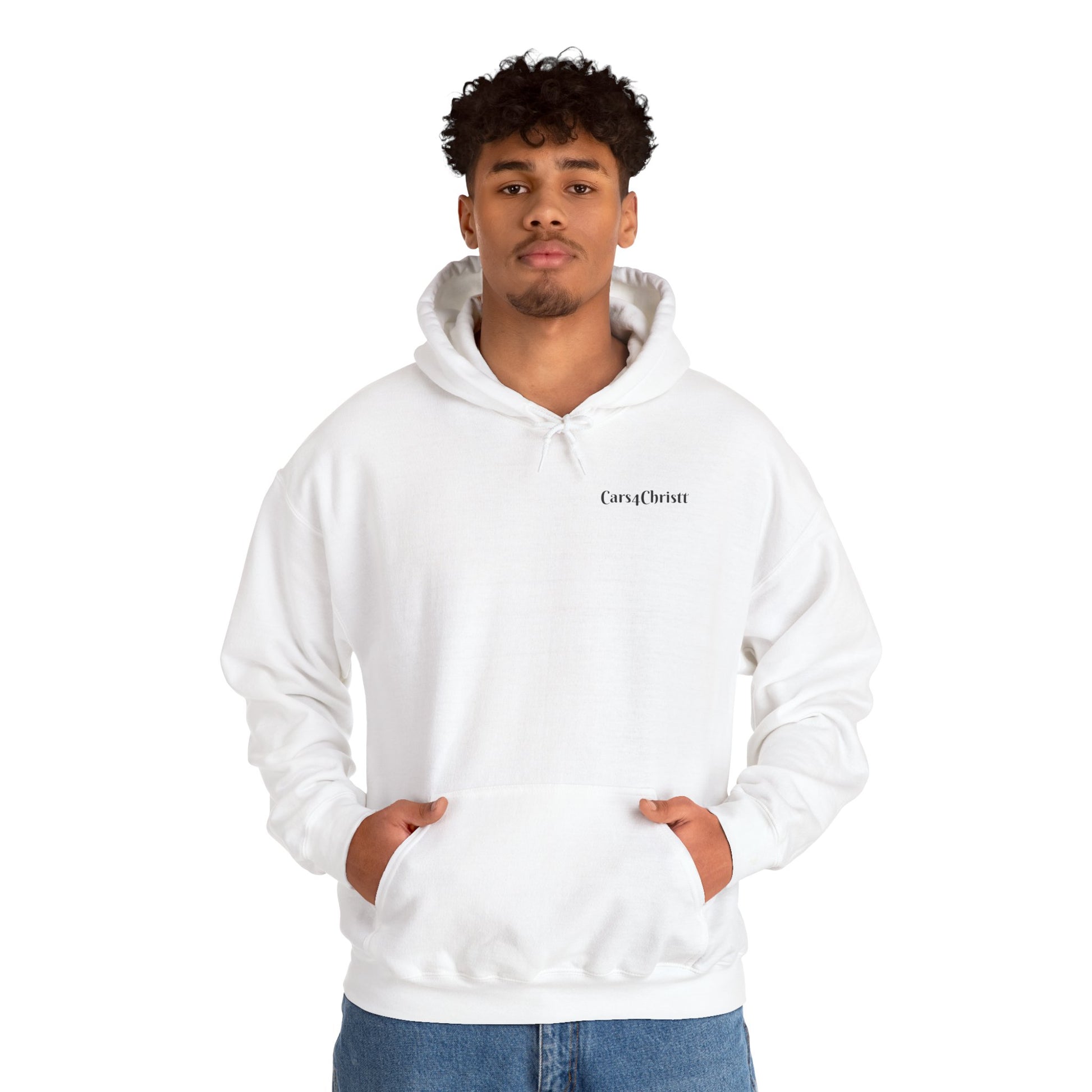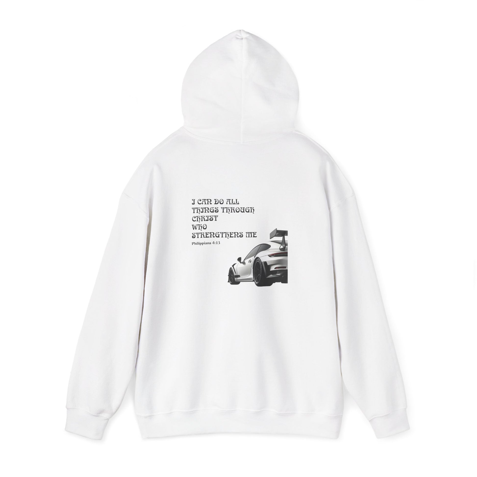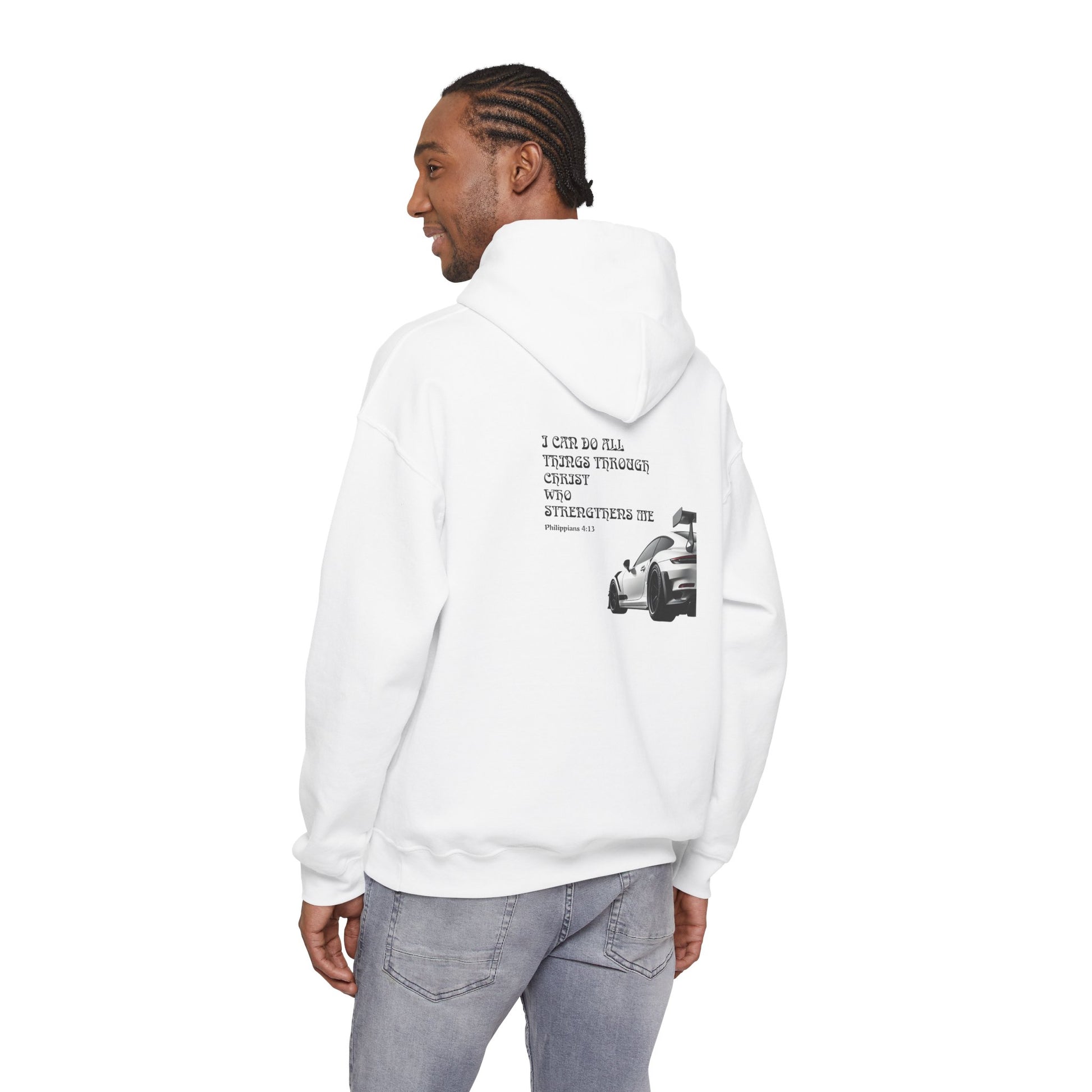 This cozy hoodie carries a quiet confidence — soft, warm, and subtly bold. The front shows a small, minimalist wordmark near the heart. On the back, a monochrome sports-car image sits beside an uplifting scripture line, giving the piece a look that’s equal parts contemplative and driven. Wear it to slow morning coffee runs, late-night garage sessions, or to feel grounded during a long drive. The double-lined hood and roomy kangaroo pocket make it easy to tuck hands and thoughts away. It’s a hoodie that blends faith and speed without shouting — thoughtful, wearable, and built to follow your rhythm.