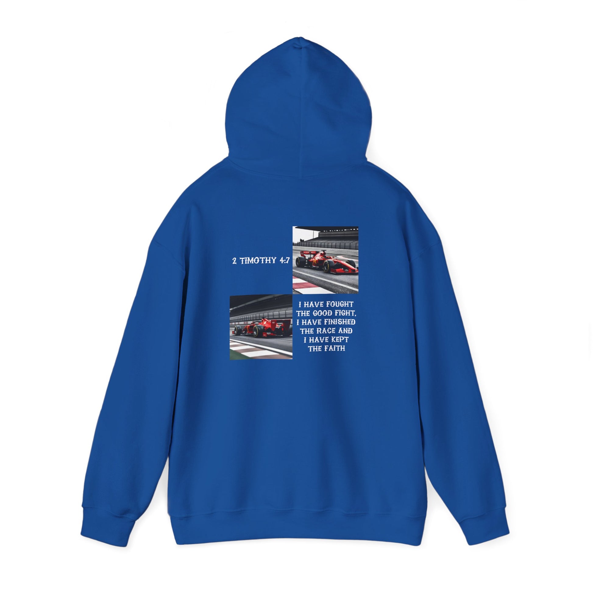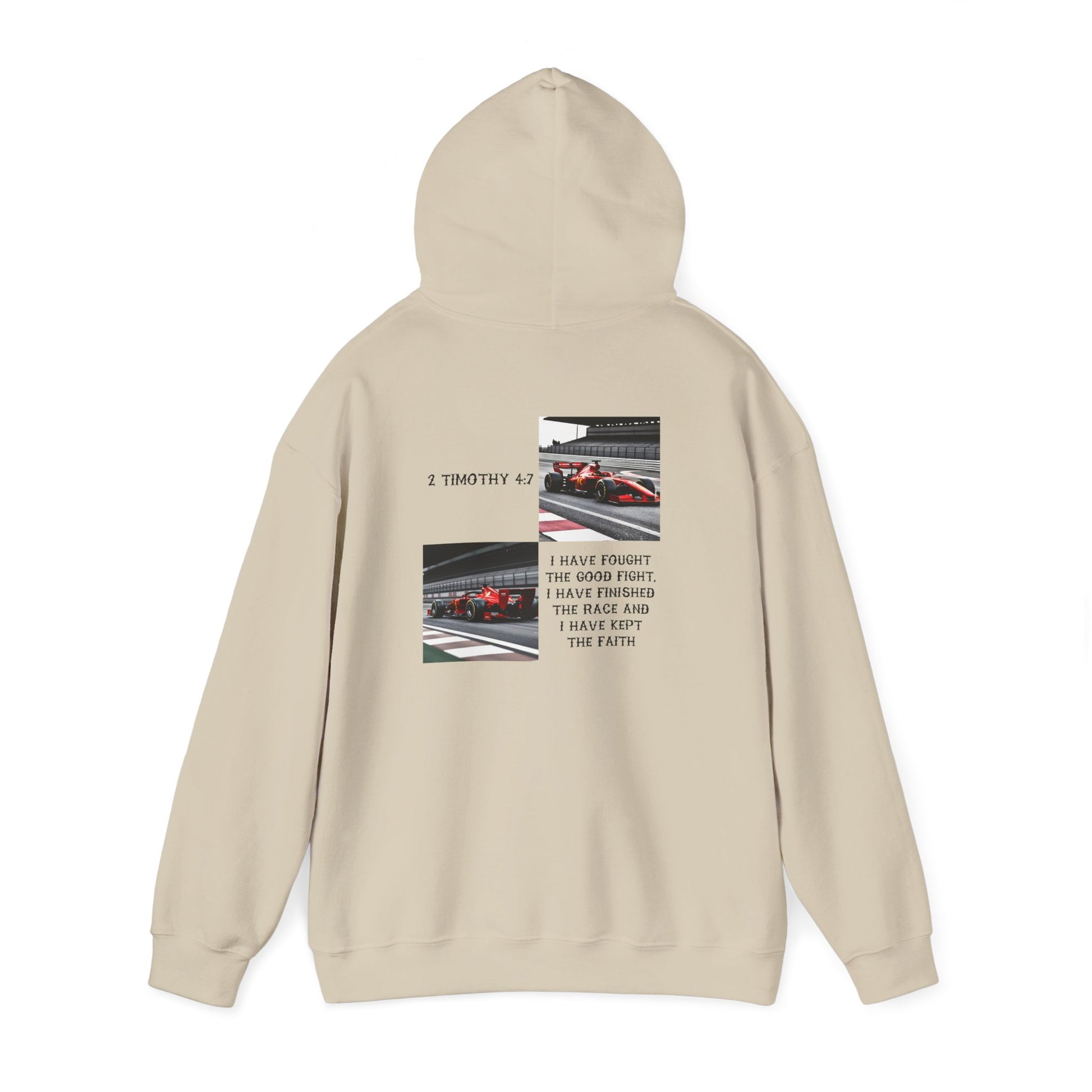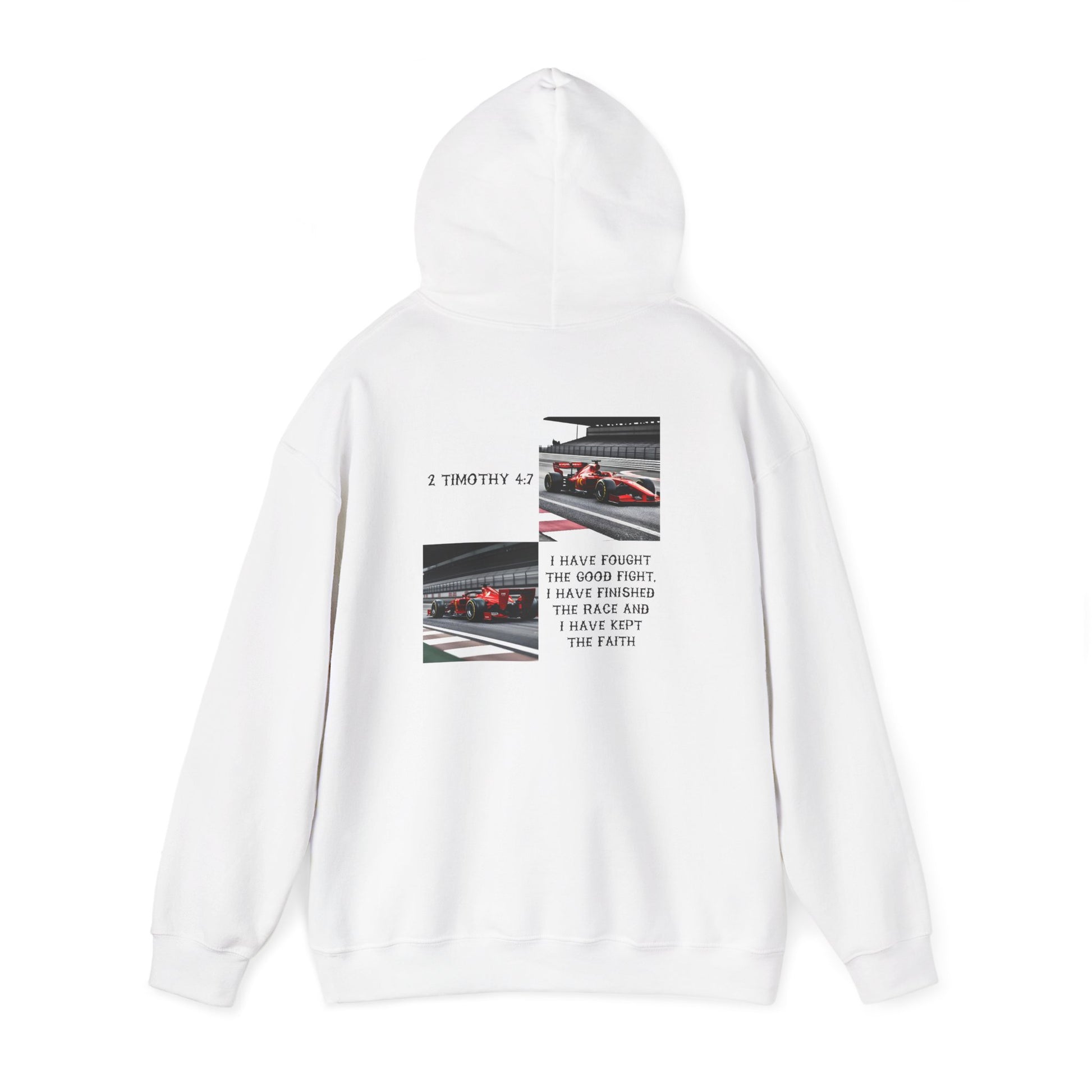 This hoodie brings a quiet, focused energy to everyday wear. The roomy kangaroo pocket and double-lined hood make it feel familiar the moment you slip it on. A clean white canvas with a subtle collage on the back — action shots of a racecar and a small, thoughtful verse — gives the piece a meditative, motorsport-inspired vibe. It’s made to be worn between morning coffee runs and late-night drives, a soft, warm layer that carries both motion and meaning.